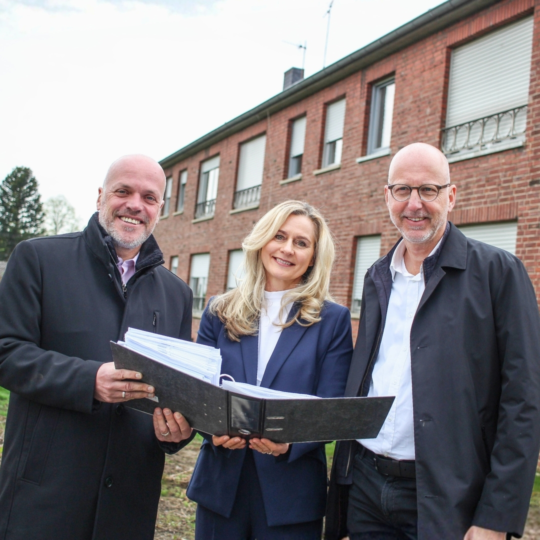 AktuellesEin Blatt Papier mit großer Wirkung: Bürgermeister Klaus Krützen überreichte die Baugenehmigung für den Campus Herkenbuscher Weg an den Vorstand der BAUVEREIN GREVENBROICH eG.