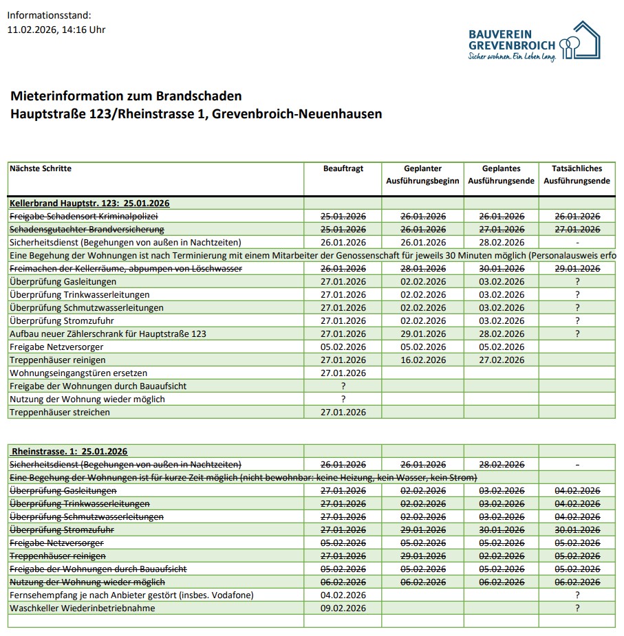 Unser gesamtes Team arbeitet mit Hochdruck daran, Ihnen so schnell wie möglich eine sichere Rückkehr in Ihre Wohnungen zu ermöglichen. Dabei sind wir auf die Einschätzungen, Prüfungen und Freigaben externer Fachleute wie der Kriminalpolizei, Brandschutzexperten, der Versicherungen sowie verschiedener Fachfirmen angewiesen. Diese Schritte dienen Ihrer Sicherheit — sie benötigen Zeit, werden jedoch mit höchster Priorität durchgeführt.